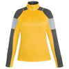 The North End Women's Campus Gold Quick Performance Interlock Half-Zip Top includes an inside placket and chin guard that complements the stylish rolled collar. Wear this quarter zip to casual company outings and civic events, but make sure to place your corporate logo on the large chest imprint area. Moisture wicking technology keeps you comfortable during the most intense workouts. Rugged polyester interlock resists the types of rips and tears that render other quarter zips obsolete. The center front semi-automatic lock zipper includes a rubber pull tab for convenience. Several storage pockets allow you to have instant access to your electronic devices.
