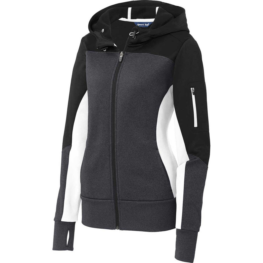 Contrast coloring and a smooth matte finish highlight the design features of the Sport-Tek Ladies Black/Graphite Heather/White Tech Fleece Colorblock Full-Zip Hooded Jacket. The double knit jacket resists snags and pilling. One-hundred percent highly breathable polyester ensures you remain comfortable throughout a long hike. Princess seams and integrated front pockets offer the double benefits of sleek design and long lasting performance. The front pockets allow you quick access to electronic devices. Attach a custom logo on the jacket to put your brand in front of potential customers. Place your hands in the thumbholes to keep your hands warm.