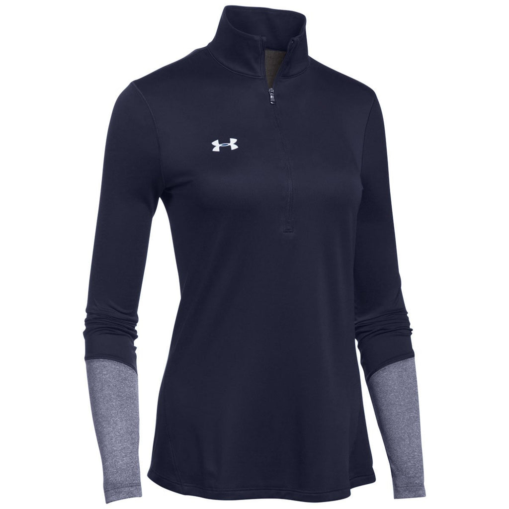 Reward the members of your hard working team by giving away the custom Under Armour Women's Midnight Navy Locker 1/4 Zip. Designed with 100% polyester, the stylish quarter zip withstands the punishment delivered by frequent use, and maintains its look. Ultra soft fabric feels smooth against the skin to give you the ultimate in comfort for a long day at the office. Add a custom logo on the large imprint area to reach more potential customers at business seminars. Your team will enjoy receiving this quarter zip as a piece of corporate apparel they will enjoy wearing. Simply add your logo and you're ready to go!