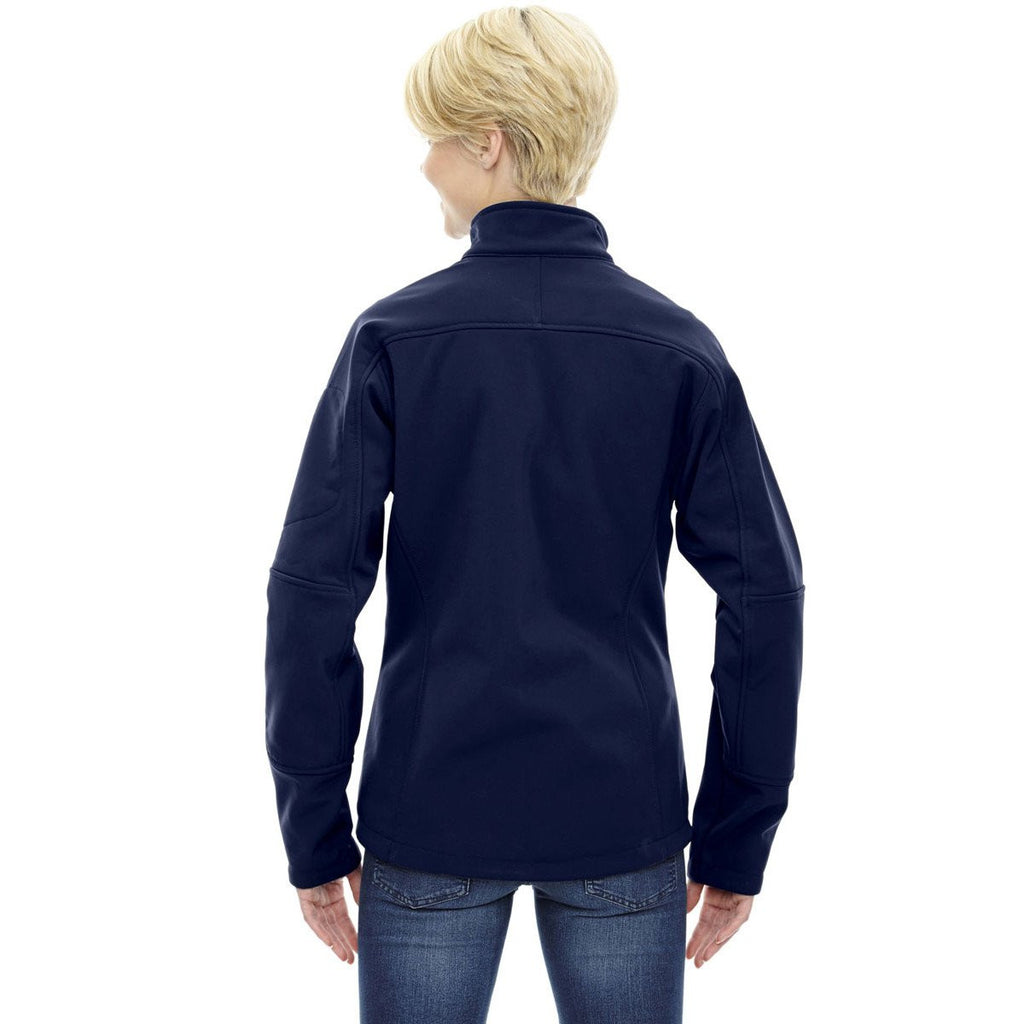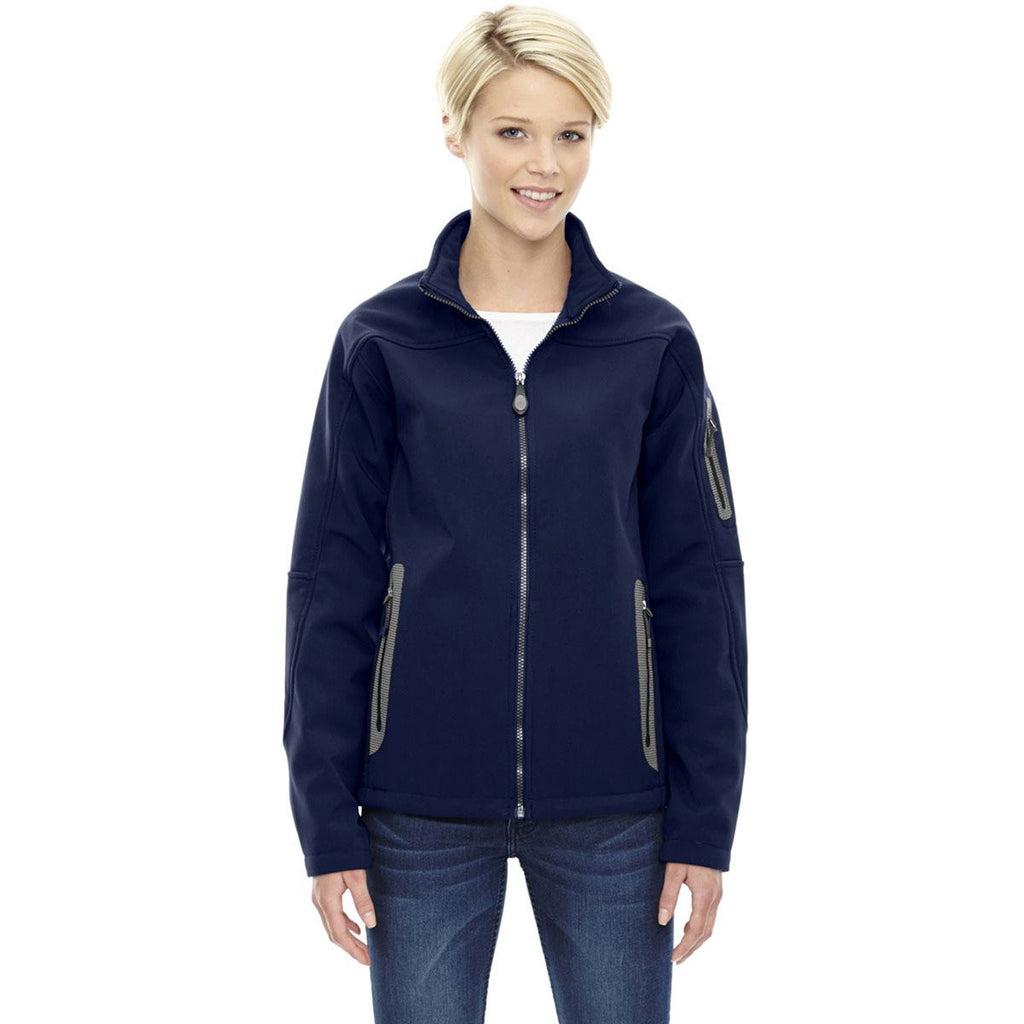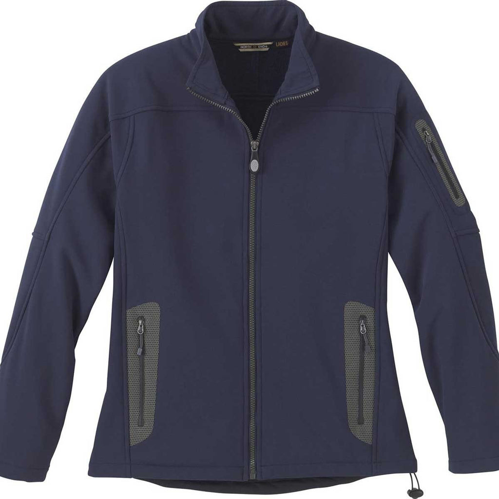 Three-layer soft shell comfort only begins to describe the benefits of wearing this popular jacket. Hybrid contrast panels located at the back and under the arms enhance the aesthetic appeal of one of the most stylish jackets on the market. Give the North End Women's' Classic Navy Three-Layer Fleece Bonded Soft Shell Technical Jacket to your loyal customers, but make sure to attach your corporate logo for expanding awareness of your brand. The mostly polyester multi-weather jacket never succumbs to rigorous use or prolonged exposure to water. Brushed tricot-lined lower pockets give you instant access to electronic devices.
