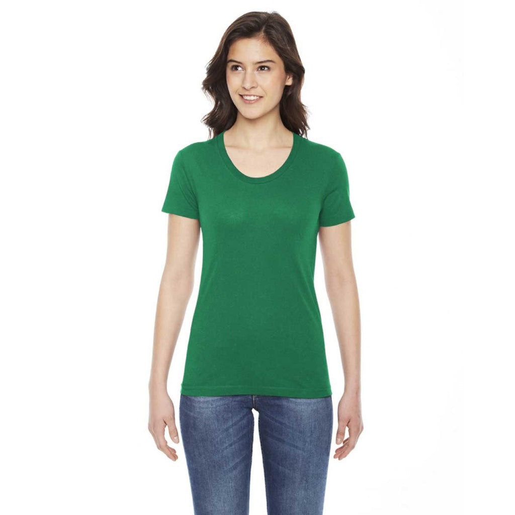 Ever wanted a comfortable T-shirt that didn’t try to be something it’s not? We’ve got a T-shirt that knows what it is and does it extremely well. This T-shirt is comfortable thanks to a 50/50 poly-cotton blend —which is exactly what a tee should be. It’s form fitting, with a durable rib neckband and comfortable shoulders—exactly what a tee should be. The only thing this American Apparel Women's Kelly Green Poly-Cotton Short-Sleeve Crewneck is missing to become the ideal T-shirt is your own custom logo printed on the front.