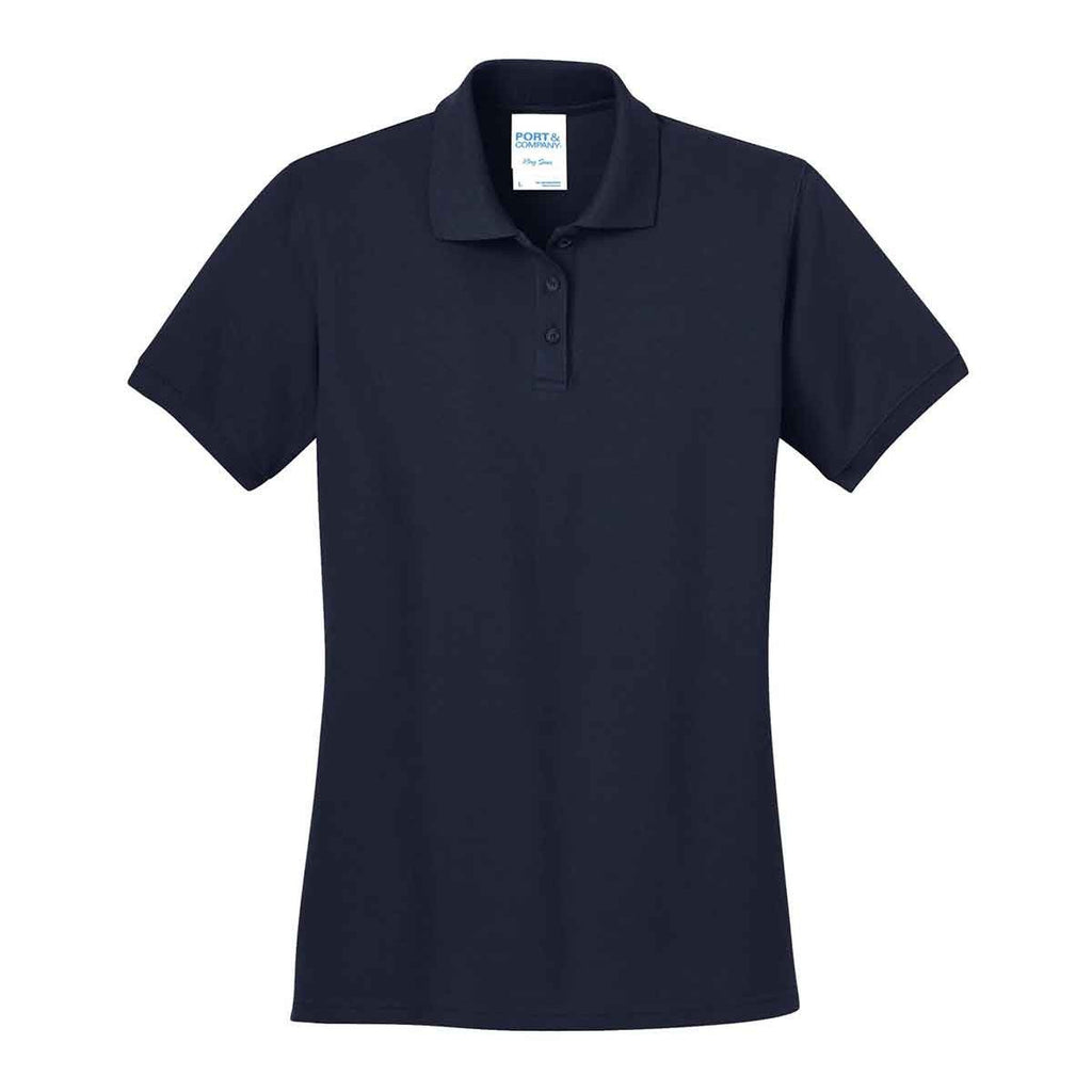 This Port & Company Women's Deep Navy Ring Spun Pique Polo brims with classic appeal. Pure ring spun cotton feels luxurious and a comfortable contoured fit makes it the perfect option for a girl on the move. Timeless polo details like button placket, dyed-to-match buttons, ribbed collar and cuffs bring sweet appeal and day-long comfort. It features double-needle stitching for durability. Treated with Soil Release finish for easy cleanups. Outfit this classic polo with a customized logo to promote the corporate identity of your company or organization to make your uniformed crew stand out from the crowd and to gain brand consistency and credibility.